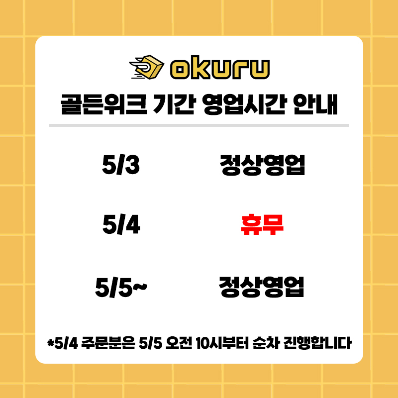 항상 오쿠루를 이용해주셔서 진심으로 감사드립니다! 26년도 5월 골든위크 일본연휴 기간동안 영업시간이 일시 변경되었습니다 골든위크 기간동안의 영업시간은 아래를 참고 부탁드립니다