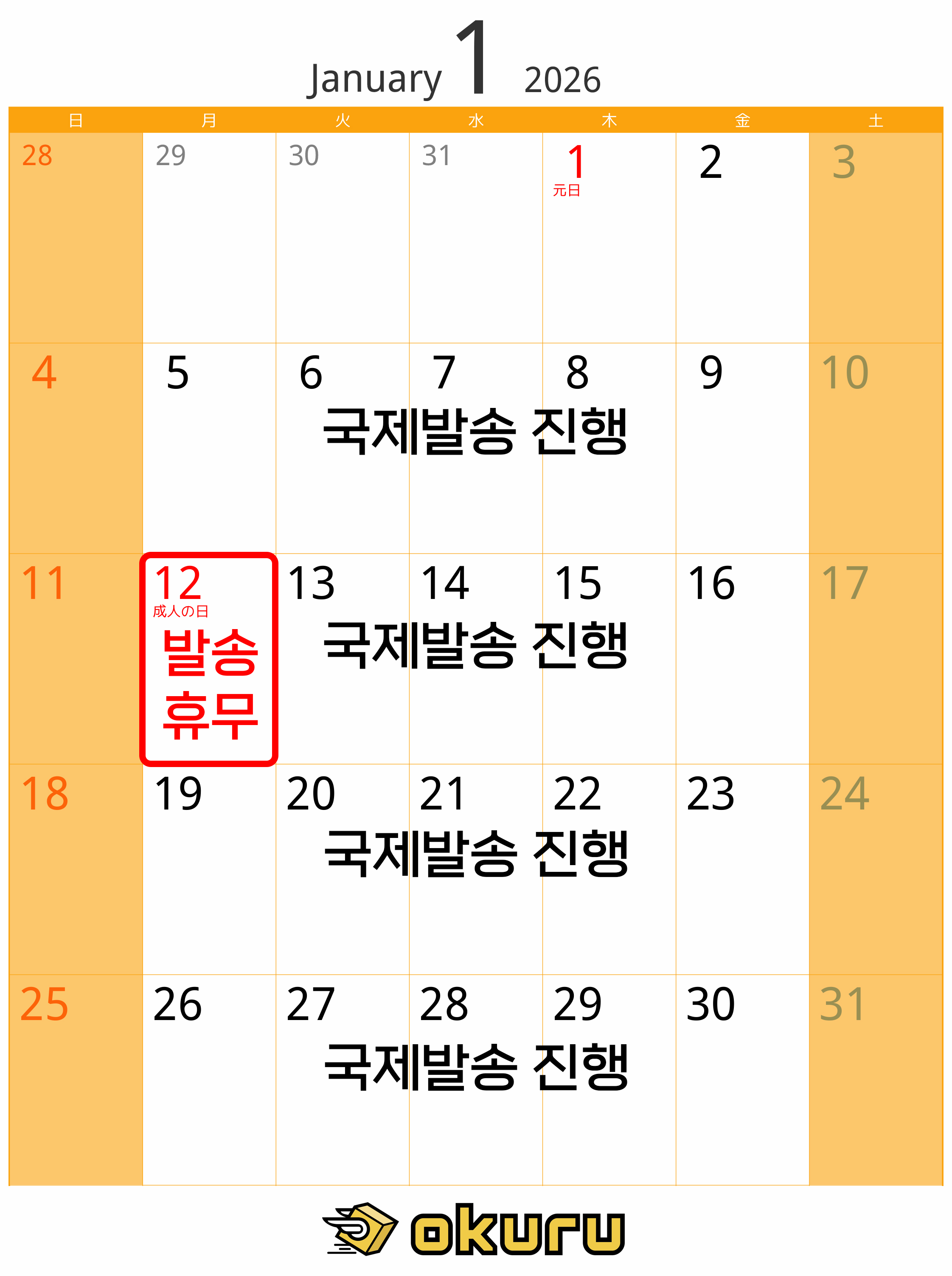 26년 1월 국제발송 휴무일 : 1/12일
